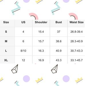 S=2/4 M= 6 L= 8/10 XL= 12 Please note: size tag is letter sizes
