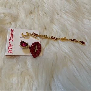 This is a pair of brand new on card Betsey Johnson Cheers Earrings. Goldtone with fuchsia faux stones. Very fun set!