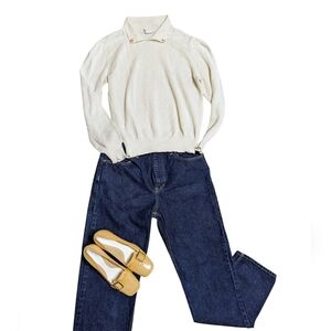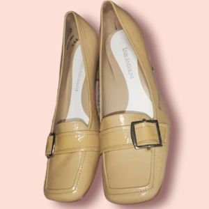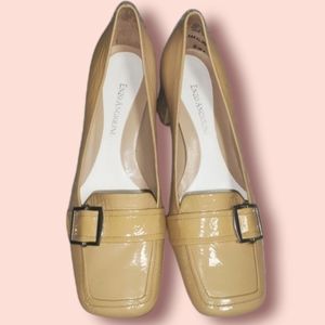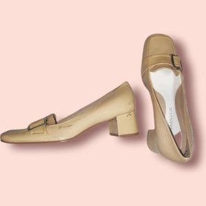 Adorable! And VERY IN right now. Loafer style, silver buckle. Cream/beige block heels from Enzo Angiolini. Some slight scuffing on the side of one shoe (see photos). Otherwise almost like new. Wear with straight leg ankle jeans. I only wish they were my size! Size 7. Heel is a modest 2".