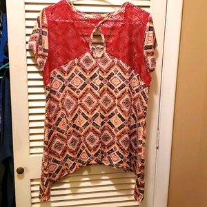 Aztec print knit top with cute peek-a-boo on the back. Super light weight and cut on a bias, so very forgiving in the waistline.