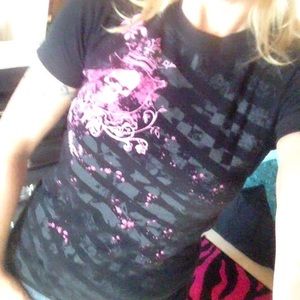 Fifth Sun size medium. Black short sleeved tee with pink/gray skull designs. Good condition. Able to ship while on vacation hold.