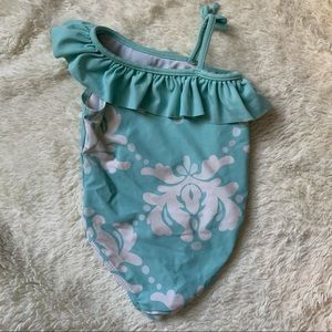 One piece bathing suit with ruffle top. In excellent used condition. Pet free/ smoke free home.
