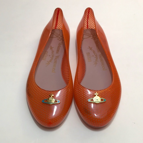These are so fun! Tangerine color w clear dots in between. Gold Vivienne Westwood symbol on the toes. Plastic wipes clean and conforms to foot.