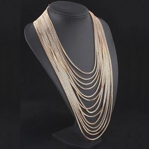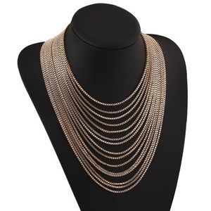 Featuring multiple cascading strands of sleek, squared-link chains, this piece delivers effortless glamour with a modern edge.