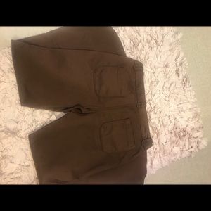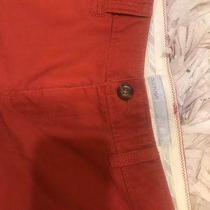 Orange/ rust pair has 2 front and 2 back pockets. Button and zip closure. 97% cotton and 3% spandex