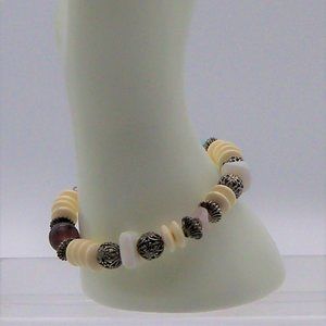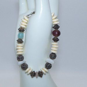 Has metal and stone beads, although I am not sure what kind of stone beads they are.