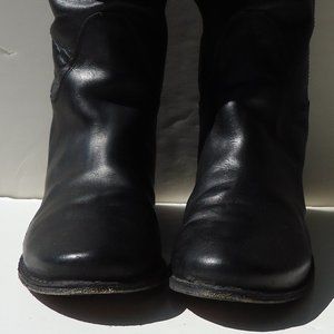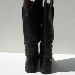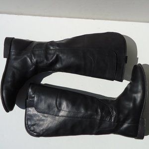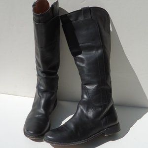 SIZE 7 B. Genuine Frye Paige tall riding black leather boots. Pull on stile. Leather upper and sole. These tall stitched-out detailed riding boots are sophisticated and sleek. Square-toe pair is made from a smooth vintage very high quality Italian leather and has a low heel. The pull tabs at side are easy for wearibility. From a smoke free home. Clean inside and out. Good preowned condition with minimal wear. Please zoom in all pictures for details and condition. Item in pictures is the exact item you are purchasing.