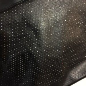 New black with silver sparkle dots beautiful bag with snap closure that would look great for an evening out as well as for the office gals for all that paper work. Measures about 17 X 12 X 3.75 inches in size. No longer made item that is hard to come by. There are small silver dots that sparkle on this when the light or sun shines on it. Beautiful bag for the office gals and a nice way to add some bling to your day.