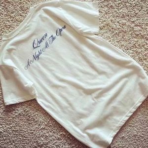White 'Queen A Night At The Opera' rock band music group graphic t-shirt.
