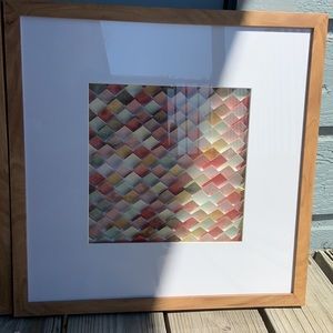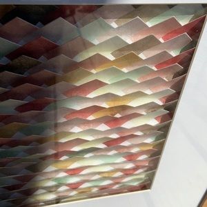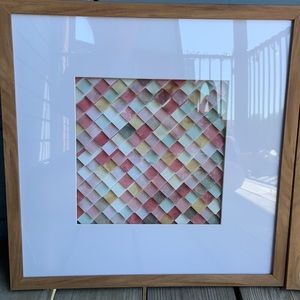 EUC. Sealed behind glass, this layered paper art is soft and understated but still absolutely makes a statement. The paper is marbled with shades of pink, blue, yellow, orange, green, and white. The array of colors makes it easy to match most decor. Comes with mounting hardware on back, as pictured. Price is firm due to overweight shipping.