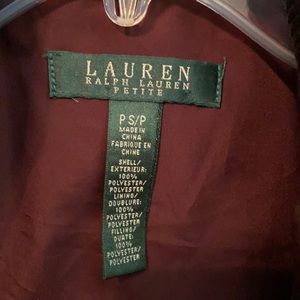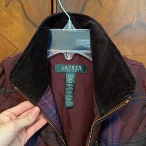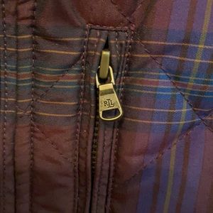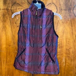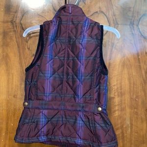 In very good used condition. This puffer vest is lightly puffed in size petite small. Gold hardware with no tarnish, zippers all work. Several different pockets. The edges and collar have a ribbed velvet feel- brown. The vest itself is a beautiful plaid of maroon, purple, blue, yellow.
