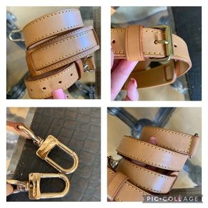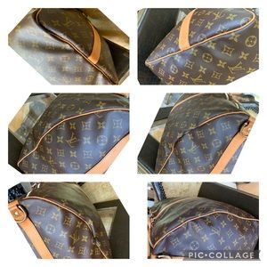 Canvas is spectacular and free of cracks or tears. Vachetta is still a light patina with a couple of random marks( personality quirks) Handles are solid with light signs of use, no cracks. Hardware is shiny and in great shape. Strap is almost flawless and a great match to the bag with light patina coloring.