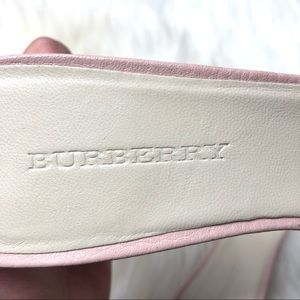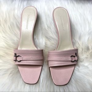 Pretty in pink! Hard color to find. Burberry pebbled leather slide sandals. The front band of leather has a strip on top with a silvertone Burberry trademark buckle. The entire shoe is bordered in pink leather. Wooden 2 3/4 inch heel. Made in Italy. Does not come in original box.