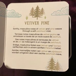 Vetiver Pine: Earthy, masculine notes of vetiver and pine weave through a soft patchouli mist.