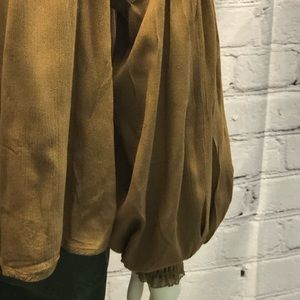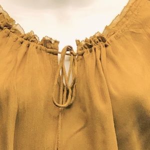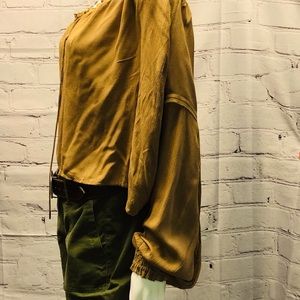 This lovely viscosa top from free people gives off a very peasant vibe it’s got the gathered neckline which has a lace through allowing you to wear this tightly or more open and off the shoulders as I have shown in a photo. The arms are billowy and then gathered at the cuff with elastic and also have a bicep cuff which I personally love. The entire shirt has a large flowey feel and is very freeing I’d say it really has the festival BOHO FEEL to it. In a coffee color that matches everything in your closet this versatile top is ready to be worn off or on your shoulders and ready to make you feel soft sexy and ready to enjoy day or night fun (wrinkle resistant too. )😃