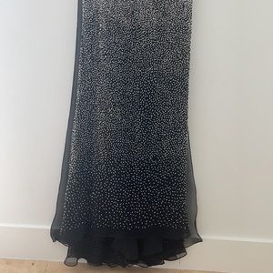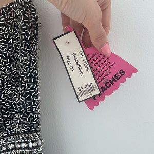 On the main picture it shows a blue color! I put it up so it can be seen on body! The dress is silver/black! Never worn, but received with some small damages , which can be EASILY fixed by its own or with a tailor! Will show on a picture! Its a size 00! Style 11289! For very small upper shape , to zip up a dress. I am 84 cm in breast and 60 cm in waist and it did not close! Breast has to be smaller. Still has tags , needs to be ironed nicely, was in closet hanging for a while.