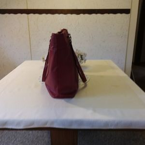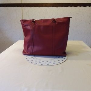 This largest bag has 3 large inner pockets. The center pocket is for a Laptop. On one side it has a zippered pocket with a small open pocket for pens. There`s also 2 large open pockets outside on both sides. One of the pockets liner is ripped. See the picture. The rest of the bag is in great condition. Measures 15" tall, 17" wide & the straps are 12" High. SKU 733126