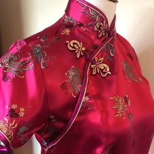 Purchased in 1995 in San Francisco Chinatown and never worn. Has been in a closet since with only the tiniest of snags as pictured. Unlined Rayon. Deep pink in color. Side zip, snaps and frogs up the collar. Two side slits. Size is listed as 34, but please see approximate measurements.Bust across underarm to underarm 16.5”. Waist 14” across. Hips approximately 18” across. 41” shoulder to bottom hem.