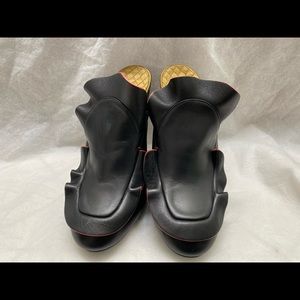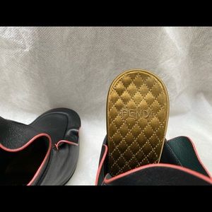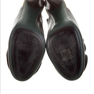 Black leather Fendi round toe mules with tonal stitching, ruffle trim throughout & covered heels.