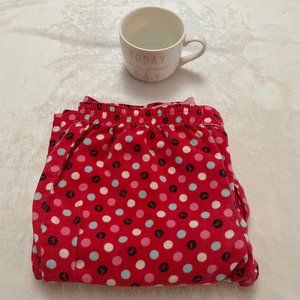 Super soft Victoria's Secret PINK pajama pants! Size XS. Red with white/blue/pink/black polka dots. "Cuddle up in Pink." There is one small hole (as pictured).