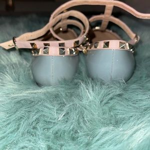 These amazing flats are a beautiful dove blue patent leather with a nude leather trim. The metal is a gold color and they have 2 buckle straps that buckle around the ankle. Gently used.