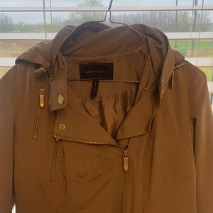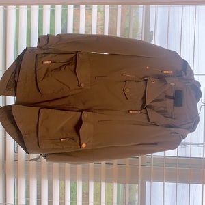 Grayish/green with gold embellishments. Two front large pockets w additional zipper pocket.