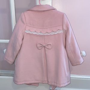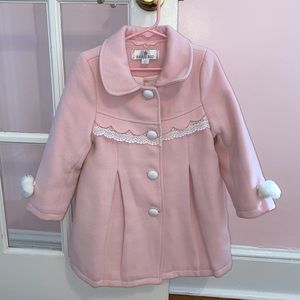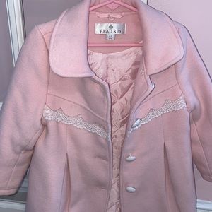 Beau Kid size 4-5 Light pink , lace trim, coat and hat. Perfect condition, sleeves have removable fur Pom poms. Fully lined for warmth.