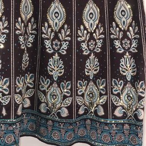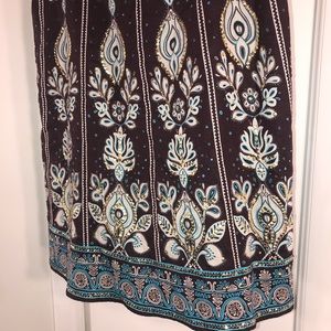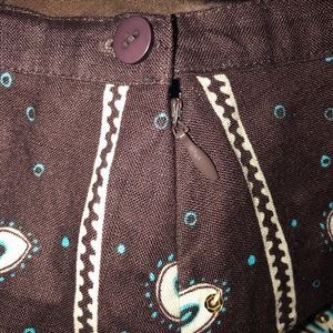 Beautiful quality linen skirt by Carol Little label. If you know anything about the label, people collect her pieces. Beautiful brown with ivory and blue pattern and gold sequins. Side hidden zipper and button. Fully lined. Size 6. Good preowned condition.