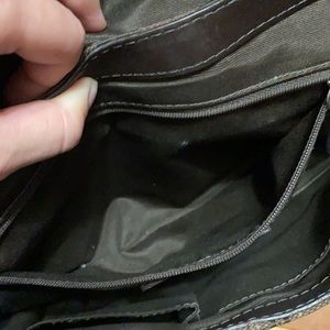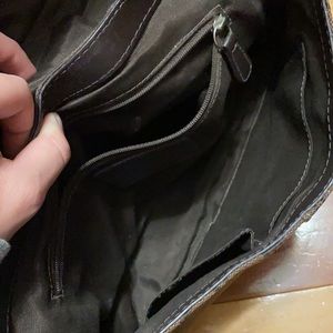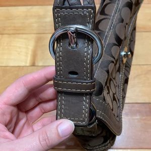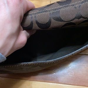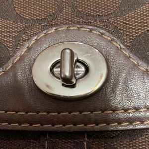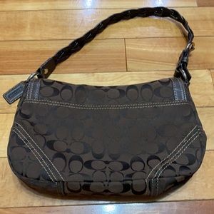 Authentic brown Coach purse with leather trim. Clasp close with braided leather strap. Cloth inside with 3 pockets. Extra back pocket. Some minor discoloration on the bottom, but overall excellent condition. Measures 11.5 x 7 inches.