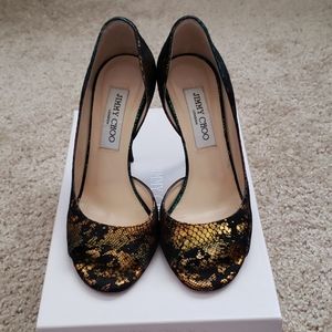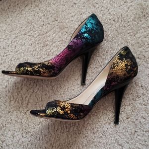 Jimmy Choo RARE rainbow suede heels sz 6/36. These heels are no longer available and are gorgeous and one of a kind. Rainbow metallic snakeskin print on black suede. Peep toe d'orsay 4" stiletto heels. These have been worn but are in EXCELLENT condition. Taps should probably be replaced but other than the wear to the bottom of the shoe and a very minor and NOT noticeable mark on the suede in the back (see last photo) ,these shoes are STUNNING.