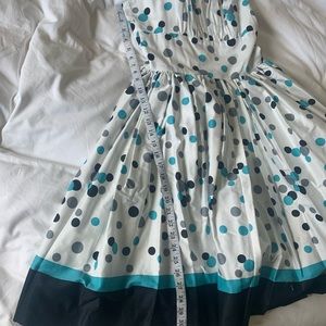 Other style tags: polka dots, sundress, pinup, rockability, retro, modern vintage style, spring, summer, pockets, sleeveless, spaghetti straps, turquoise teal, navy blue, mid-century modern style