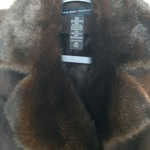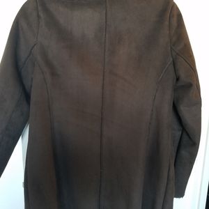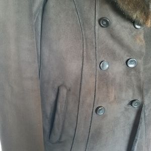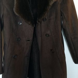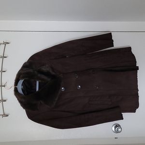 Soft brown coat, faux fur collar, and softly lined on inside. Two pockets. Button down. Gently used a few times; great condition. Length approx 30". *almost vintage