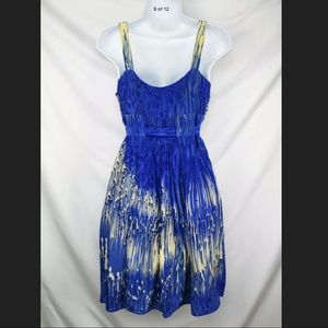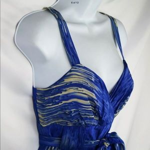 Lil Caballo Falls Dress in the blue color way. Gorgeous silk dress with crossover/sweetheart neckline, wide shoulder straps and a coordinating silk sash. Blue with "waterfalls" abstract.