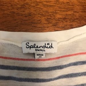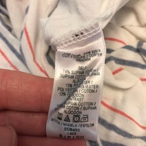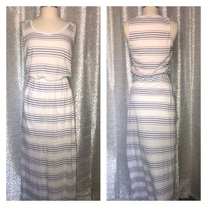 Light weight summer maxi dress with light red and blue stripes. Elastic waist gathering and a high slit on the side. Had a half slip underneath