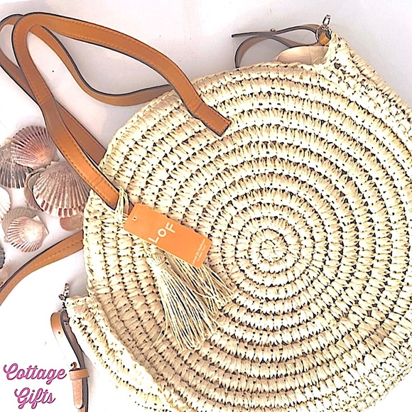 This NEW straw bag has 2 tassels on the handle, and has a long crossbody strap as well as shorter carry handles.