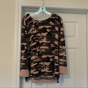 Sanctuary lightweight camo sweater. Back is slightly longer than the front with super cute ribbon detail at the neck.