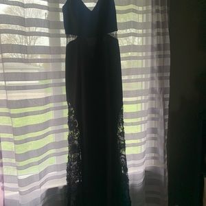 I loved this dress! Wore it to my junior year prom. It’s lace on both sides of the dress as well as lace around the waist. It also has a gold zipper going up the back