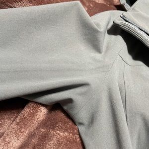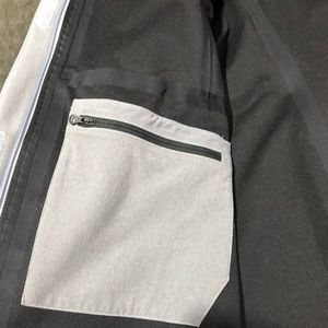 Smoke free home. I would recommend wearing this with a fleece underneath, great for rain or snow. The color is dark grey.