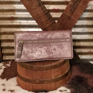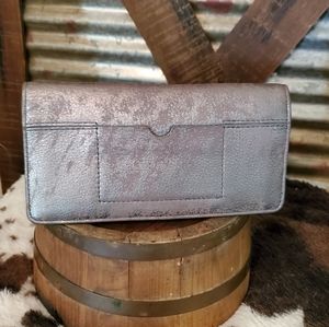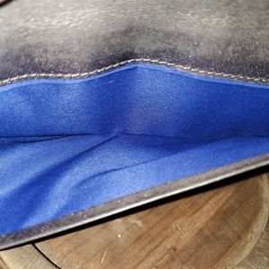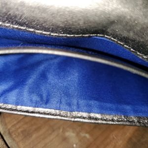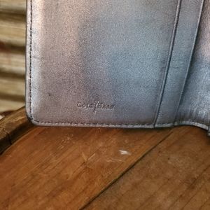 #587 Cole Haan Silver Leather Wallet with blue lining in great condition. No tears no stains and has lots of compartments. It beautiful!