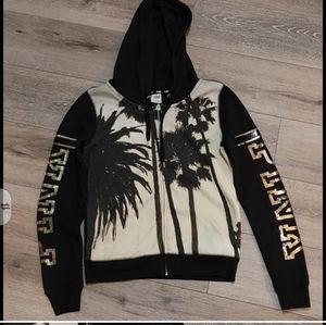 Victoria's Secret Pink full zip hoodie sz small used great condition. Has beautiful palm tree images and both arms sequined with the Pink logo. Hoodie is black, sequins are gold, image is grey, black and off white.