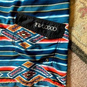 Body Glove Voodoo Aztec board surf swim shorts. 34” waist, inseam 9.5”. . I love this tribal Aztec print and colors!. Size tag is miss, go by the measurements. Even though logo is a little faded the color print is still vibrant. Vvelcro is worn underneath pocket and at fly however the drawstring does the job. These look great!
