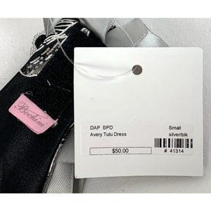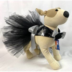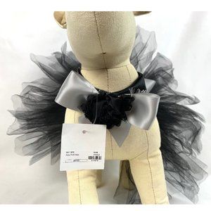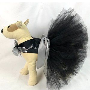 Bochini Avery Tutu Dress in black & silver color available in S and M sizes. This dress includes a velcro closure at neck behind a dimensional fabric rose. The skirt is secured by the wide silver satin ribbon which rounds the girth and is then tied in a bow on top. The piece is in excellent condition, all netting is crisp and no tears or wrinkles. Please note that the medium size does run small. New with tags. Dog model not included.