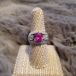 Lab Created Pink Sapphire w/28 Cubic Zirconia Sterling Silver Ring, Size 9, NIB.