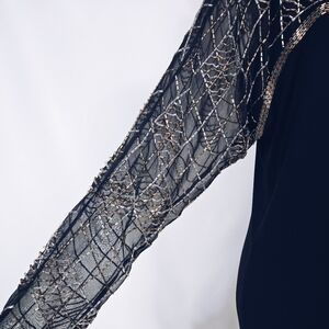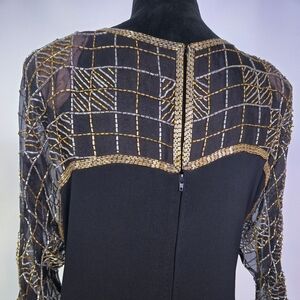Gorgeous black dress with sheer beaded top and sleeves. Small split up back. Zips up back with keyhole hook closure. Light shoulder padding that can be removed if desired.