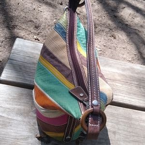 Vintage Fossil patchwork hobo with wooden key, EUC