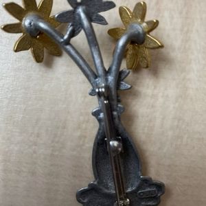 Vintage Signed JJ Jonette Pewter & Brass Flowers in Vase Pin/ Brooch.