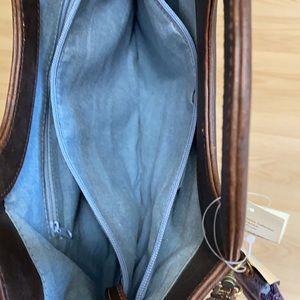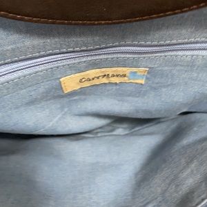 Super cute canvas bag with faux leather trim! Lined interior is separated by a large zippered compartment & features a side zippered pocket & a slip pocket. New without flaws!💜