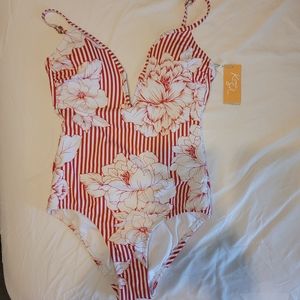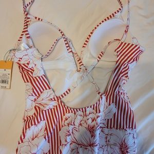 Sexy, low cut front with metal piece to keep in place, low cut criss-cross back, and padded bra area with adjustable straps one piece swimsuit.