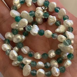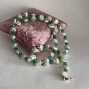 This is a gorgeous genuine freshwater cultured pearl and emerald green bead necklace. The clasp is made of solid sterling silver. It is stamped 925 for sterling silver on its latch. The necklace measures 18 inches long and is in excellent vintage condition.