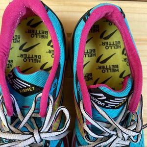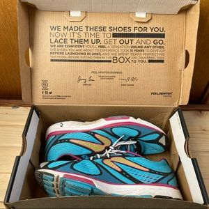 Newton Kismet running shoes, women’s size 9. Preloved condition. Shoes and shoebox are dusty from running outside, but soles have a lot of miles left! Footbed is in great shape! Slight piling on ankle, where white socks have transferred. Please inspect all photos carefully and feel free to ask questions!